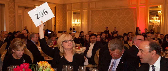 The auctioneer asks guests to raise their bid on high-value packages by raising their bidder cards.